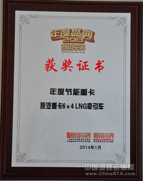 陕汽德龙F3000 LNG重卡荣膺“2013年度节能重卡”奖牌