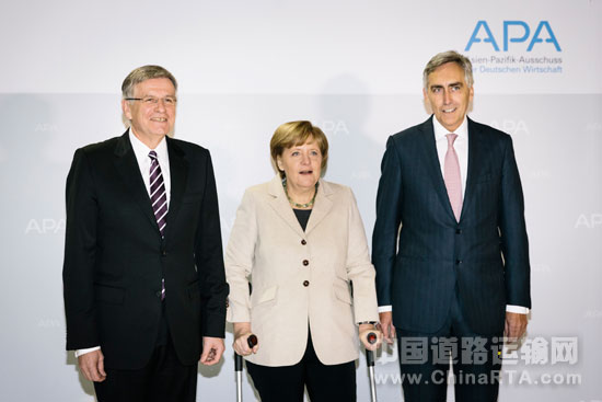 德国总理默克尔与新任德国经济亚太委员会主席林哈德,前任主席罗旭德在就职仪式上