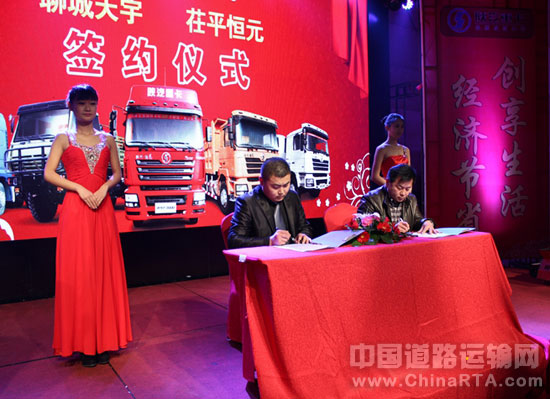 会议的一大亮点是,山东茌平恒元运输有限公司与聊城天宇汽车销售服务有限公司现场进行新M3000批量重卡签约仪式。