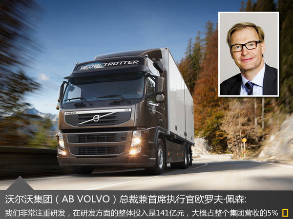 目前许多乘用车制造商和科技公司正在对无人驾驶等前瞻科技进行研发,不过来自瑞典主要生产卡车、客车等运输类产品的沃尔沃集团(AB VOLVO)也加入了这一行列。据了解,该集团每年注入大量资金用于研发新技术,近日沃尔沃集团总裁兼首席执行官欧罗夫·佩森先生表示:“沃尔沃集团非常注重研发,在研发方面的整体投入是150亿瑞典克朗(约合141亿元人民币),大概占整个集团营收的5%”,此外,他还指出:集团目前正在对无人驾驶技术和替代燃料等技术进行研究。