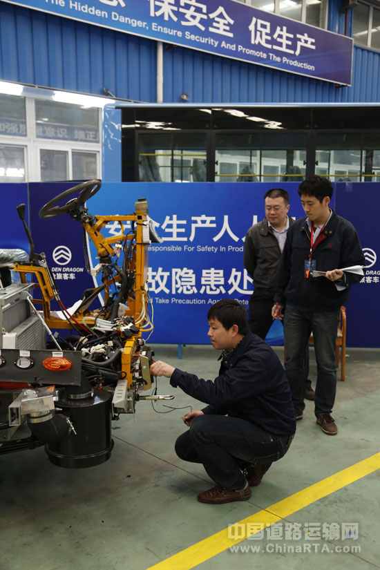 彭东庆:汽车维修可分为机械维修和电气维修两个大的方向,机械维修属于较基础的部分,而电气系统是汽车上最复杂、应用高新技术最多的部分。随着客车电子化程度越来越高,电气系统也越来越复杂。目前,金旅客车已经100%应用总线技术,可以说,能想到的地方都能够通过电控来实现。