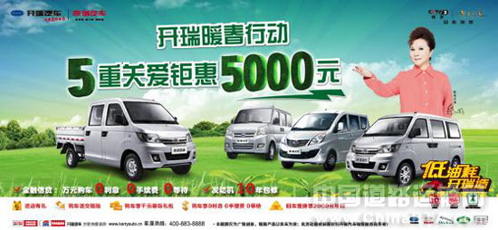 步入2014年的开瑞汽车仍以服务为纲,春季伊始就打响旨在深化服务、回馈新老用户的大型服务促销战役“开瑞暖春行动”。只要客户到店购车即可享受价值高达5000元的5重好礼。区别于其他厂商的促销活动,开瑞“暖春行动”重头戏是服务,“0利率、0手续费、0等待”的购车金融服务在业界可谓优势巨大,为贷款购车客户省却繁琐流程,也减轻了中小创业者的资金压力,为正走在创业致富路上的人谋得福祉。同时,为了满足微车用户升级、换购的需求,“暖春行动”中推出旧车置换补贴2000元的专项补贴政策,快速、透明的置换流程,让换车用户轻松实现升级爱车的梦想。
