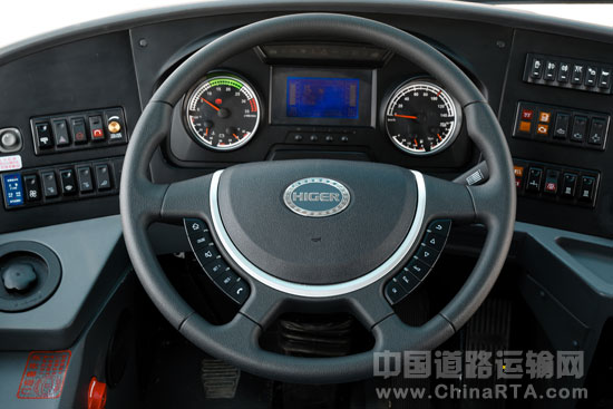新一代全新造型多功能转向盘是海格E系新中巴产品实现轿车化设计的一大亮点,它在很大程度上满足了驾驶员对于轻便驾驶的各种需求。基于海格整车CAN总线系统开发的多功能转向盘,可实现G-BOS播放系统的便捷操作;此外,多功能转向盘设置的车道偏移方向盘震动提醒功能,将有效提高车辆驾驶安全性。