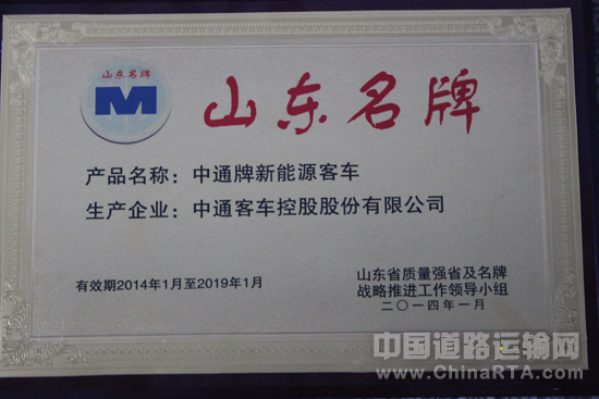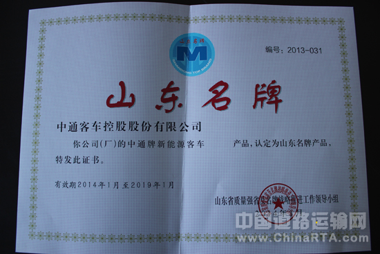 中通客车为深入实施名牌战略,提升企业质量竞争力,2013年积极响应质量强省建设,扎实开展“品牌建设年”活动,通过材料公示、资格审查、专家评价、评价软件自动评分、预选名单公示、省质量强省及名牌战略推进工作领导小组审议等评审程序,中通新能源客车被评为2013年山东省名牌产品称号。