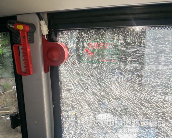 大金龙市场部经理王洲龙介绍,“自动爆玻器”的外形是一个红色装置,内置钨钢金属头,安装在车辆头尾以及左右共四面窗户上。当危险事件发生时,驾驶员只要点按下方向盘左手边的按钮,自动爆玻器就能在最短时间内使四扇8毫米厚的车窗玻璃爆裂,大大提高逃生率。公交车车窗均为钢化玻璃,遇外力破碎时不会出现喷射状爆裂,确保乘客人身安全。
