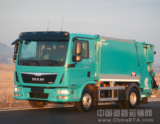 其中,配备有静液驱动混合动力系统的三轴MAN TGM卡车是为满足市政部门要求而专门设计的。静液压驱动混合动力系统又被称为静液制动能量回收系统,该系统特别适用于频繁制动和起步的车辆如垃圾回收车辆的使用。该系统制动时回收制动能量、起步时提供驱动能量,从而降低燃油的消耗和二氧化碳排放,同时还可降低刹车片的磨损。该系统可以有效减少使用成本,并对环境进行保护。