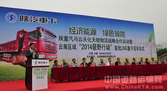 5月13日,以“经济能源 绿色领地”为主题的陕重汽与云天化天驰物流战略合作启动暨云南区域“2014碧野行动” 首批LNG重卡交车仪式在云南水富盛大举行。云南水富县人民政府副县长袁伟、陕重汽销售公司副总经理刘翔韬、云南水富云天化有限公司党委书记梁洪、天驰物流有限责任公司总经理任立志以及产业链领导,经销商等100余人出席此次活动。