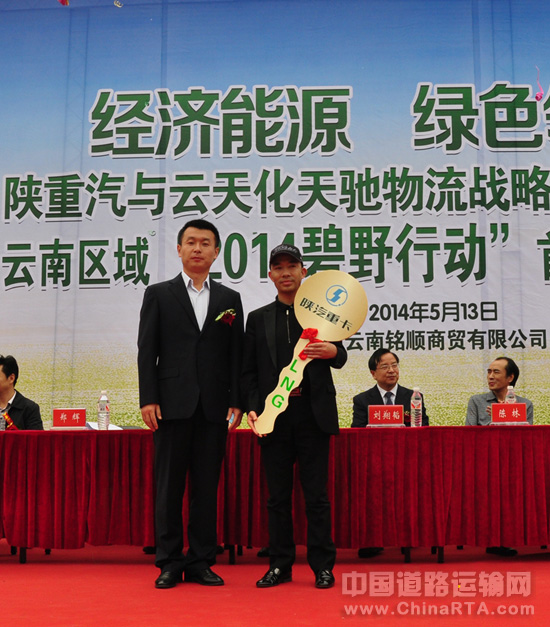 陕重汽销售公司昆明办事处主任郑辉为镇雄天驰物流有限责任公司董事长沈佼交付象征开启重卡财富之门的金钥匙,不仅拉开了陕汽重卡天然气产品云南区域“2014碧野行动”的大幕,也预示着陕汽与天驰物流有限责任公司开启全面合作的新步伐。