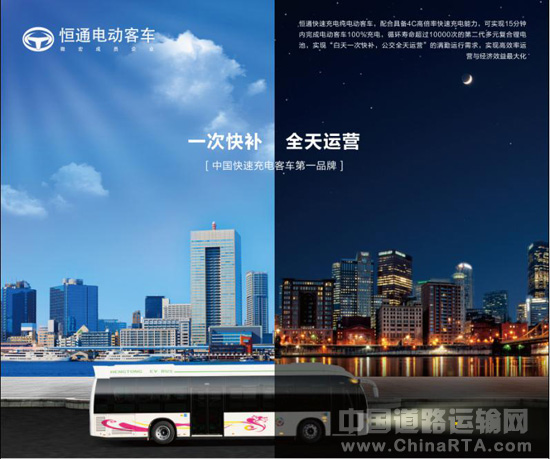 恒通新能源客车已经经过三年多的运营实践,恒通插电式快速充电新能源客车已有1000多台投入重庆46条公交线路上运营,另有100多台车投入贵阳、德阳、遵义等地多条公交线路使用,成熟的新能源客车技术进入大规模推广阶段。恒通电动15分钟快速充电技术这种新的运行、能源配置和补给模式,具有的充电时间快、电池寿命长、重量轻、充电站占地面积小、运行成本低等优势,完全满足城市公交运行的实用性、商业化需求。得到行业专家的充分肯定,成为重庆市政府构建低碳交通运输体系中积极推进的项目,“快速充电客车研发及产业化”项目已列入了“十二五”国家“863项目”支撑计划,并获得世界客车联盟(BAAV)“年度巴士奖”、“年度最佳创新巴士奖”、“年度最佳环保巴士奖”、“节能与绿色新能源客车奖”等多项荣誉,美国、英国、香港、马来西亚等国家和地区相关公司的代表都相继到恒通电动公司参观考察,希望把这一全球领先的技术应用到当地。