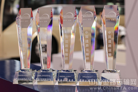 2014年5月14日~16日,北京国际道路运输车辆展以“绿色、安全、智能”为主题在京举办,并再次举行参展产品评选活动。在本次客车的顶级“选秀”中,大金龙凭借其产品性能及创新技术的优异表现,共斩获2014年度“最佳新能源客车奖”、“最佳公路客车奖”、“最佳公交客车奖”、“最佳车联网服务平台奖”、“最佳环保科技产品奖”等行业5项重磅大奖。