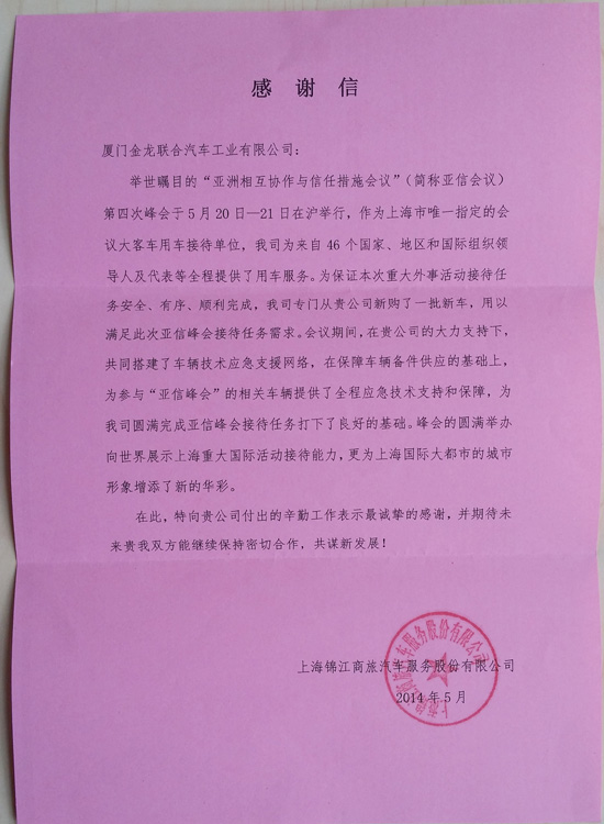 5月21日,亚信第四次峰会圆满闭幕,金龙客车也以零故障的出色表现,顺利完成交通运输服务。会后,锦江商旅向大金龙发来热情洋溢的感谢信,并赠送了锦旗,题字:“细致周到,服务彰显专业;精诚合作,保障亚信峰会。”