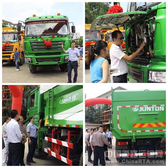 随后,陕西重汽黄换绿项目组的工作人员为前来参会的领导和嘉宾,针对陕汽开发的新型城市渣土车进行了详细的360°绕车讲解。陕汽德龙LNG新型城市渣土车威武而环保,在电路、气路、底盘、内饰等,经过32项改进,产品品质进一步提升,该车匹配潍柴12L国四天然气发动机、法士特12档变速箱,汉德独有13吨单级减速桥,500L气瓶,保证了底盘的高可靠性和超长巡航能力;在服务方面,2014年陕汽继续执行6F式大服务,针对天然气产品三包期延长到24个月,车辆第一、第三定保免费的优惠政策的不断推出,更加能体现出陕汽重卡贴心服务的宗旨,这也是对产品强大信心的体现。