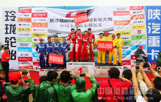 战马嘶吼,机声轰鸣,阔别一年之久,“陕汽杯2014全国超级卡车越野大赛”再度鏖战金都招远。7月25日,暴雨冲击,台风来袭,现场直播危在旦夕,赛手们不负众望,金杯闪闪收入囊中。经过风雨交加中的激烈对决,零公里润滑油队勇夺头筹,固铂成山轮胎队、玲珑轮胎队分获亚、季军。个人成绩前三名则分别被玲珑轮胎队的魏好、陕汽火箭队的杨平和固铂成山轮胎队的姜虎收入囊中。而代表本土车队的——招金银楼队未得主场庇佑,绝缘半决赛。