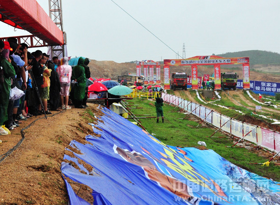 暴雨连日、台风突袭、人员紧凑,紧张的现场与高标准的要求,为本次超级重卡越野赛增加了史无前例的难度。骤降的气温与暴雨的天气,诸多赛手出现了身体不适;加之不请自来的台风,卫星信号随时可能中断,现场直播随时将会流产;除此之外,频频造访的大风,致使现场大棚飘忽不定,摄影机架左右飘摇。虽然现场环境恶劣,赛道湿滑,道路泥泞,但是各个车队依然坚强完赛,现场观众仍然热情支持,陕汽重卡在暴雨的洗礼及魔鬼赛道障的考验下,完美收场,足见陕汽军车品质可经受千锤百炼,方显真金英雄。