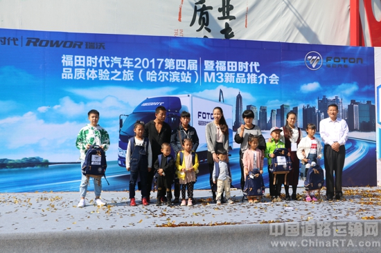 在本次品质体验之旅的活动现场,福田时代还特别举行了爱心助学活动,向卡车司机子女赠予大量学习用品。福田汽车时代事业部多年来不断参与公益事业,心系卡车人家庭及子女教育。