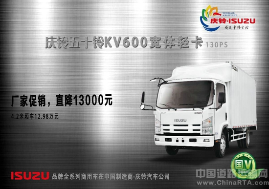 庆铃五十铃KV600宽体车则是在庆铃五十铃600P的车型基础上升级打造的安全、可靠、耐用的“新精品”,采用五十铃4KH1-CN5HS发动机,130马力,国五排放,强劲可靠,节能低耗,环保减排;驾驶室采用中型车尺寸的驾驶,宽敞、空间大,驾乘舒适、视野好;货箱容积达18m3,运输效率更高,运营成本更低。