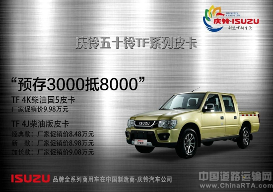 庆铃五十铃TF系列皮卡在可靠、耐久及实用性等方面独树一帜,并受到了个人用户以及政府、电力、通讯、矿山、石油等行业的信赖。