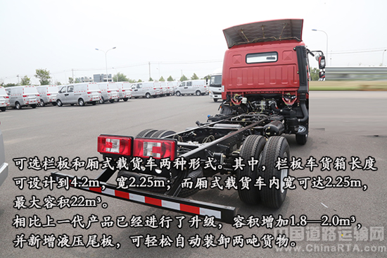 事实上,卡车最重要的属性是载货能力。开瑞绿卡城配版可选栏板和厢式载货车两种上装形式。其中,栏板车货箱长度可设计到4.2m,宽2.25m;而厢式载货车内宽可达2.25m,最大容积22m³。相比上一代产品已经进行了升级,容积增加1.8—2.0m³,并新增液压尾板,可轻松自动装卸两吨货物。