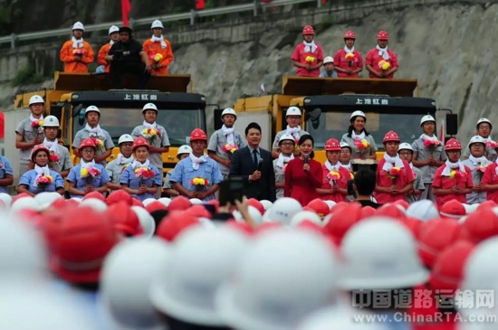 百余名身着各色工服的建设者登上朝夕相伴、高大威猛的亲密伙伴红岩重卡,挥舞双手为歌曲添彩。