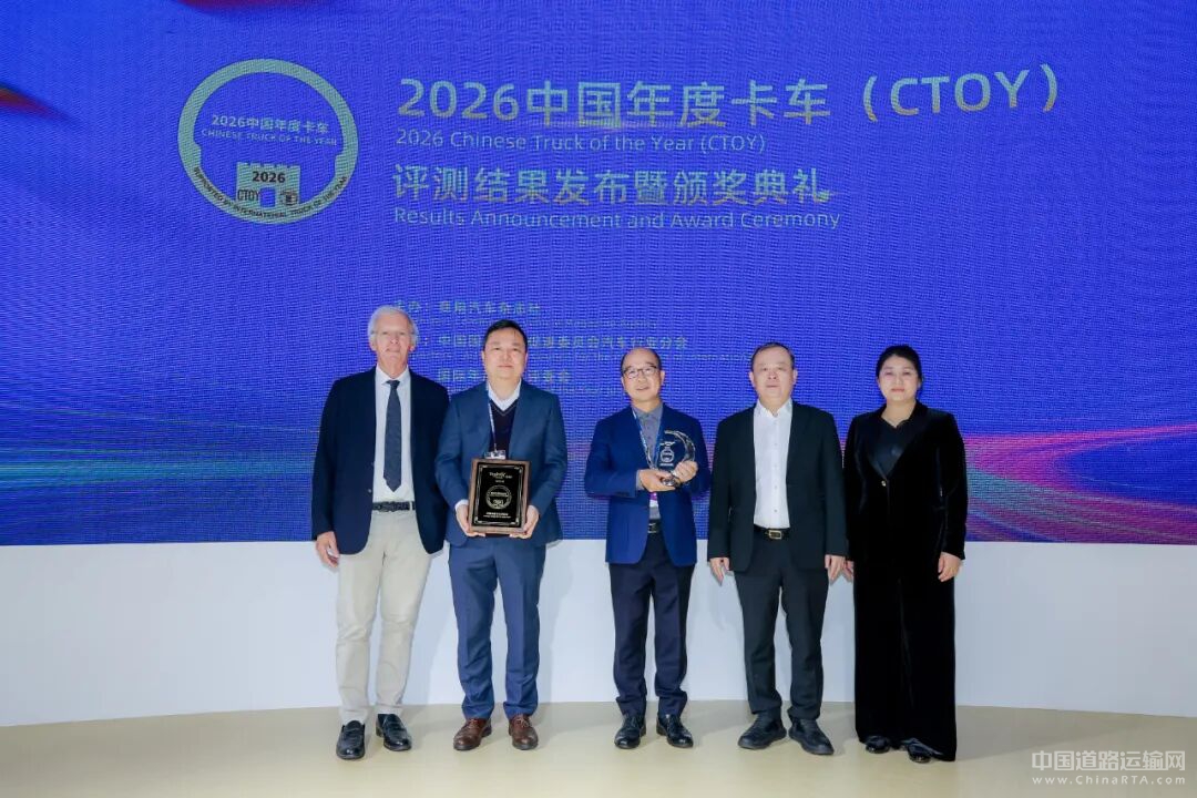 颁奖典礼上,国际年度卡车评委会主席特别顾问Gianenrico Griffini,中国国际贸易促进委员会汽车行业分会会长王侠,中国年度卡车评委会主席、商用汽车杂志社社长、北京卓众出版有限公司副总经理于晶,为海珀特颁发了2026中国年度卡车(CTOY 2026)的奖杯和奖牌。海珀特董事长黄兆勤与CEO孙营共同出席颁奖典礼并接受了象征荣耀的奖杯与奖牌。