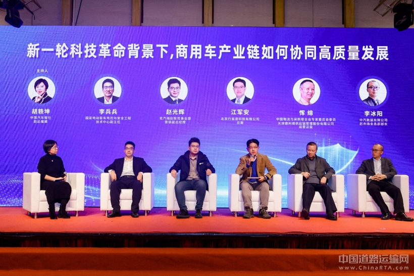 中国汽车报社副总编辑胡轶坤主持沙龙讨论环节,国家电动客车电控与安全工程技术中心副主任李兵兵,北汽福田智驾事业部营销副总经理赵光辉,北京行易道科技&英诺锐科技有限公司总裁江军安,中国物流与采购联合会专家委员会委员、天津德利得供应链管理股份有限公司运营总监恽绵,中汽数据有限公司后市场业务部部长李冰阳作为特邀嘉宾,围绕“协同创新与价值共享”、“智能化与数据利用”、“新能源车险困境”三大核心议题进行了深度对话,为商用车产业高质量发展建言献策。