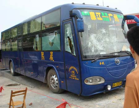2007年4月4日凌晨5时,一辆大客车从深圳开往湛江,在路经湛江市赤坎立交桥时,被两三辆小汽车逼停,从车上跳下来十余名男青年,持刀、棍将车窗玻璃打烂,扎破车胎,车上的乘客纷纷下车躲避。