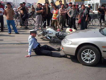 昨日下午,兰州交警在检查一辆违法停放的长途客运车时,被客运车撞伤。随后,十多名交警围追堵截将肇事车司机抓获。