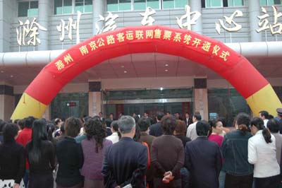 10月26日上午,滁州南京公路客运联网售票系统开通仪式在滁州市汽车中心站举行。出席开通仪式的领导有:南京市政府副秘书长刘建,滁州市委常委、市委秘书长、政法委书记李耀才,滁州市政府副市长王图强,滁州市政协副主席彭朝东,滁州市人大常委会秘书长樊承科,滁州市政府副秘书长夏金生等。参加仪式的还有安徽、江苏两省运管局有关领导,滁州、南京两地交通局、运管处领导,南京、滁州两地行风效能监督员代表及两地客运企业负责人等。滁州市交通局高怀忠局长主持开通仪式。