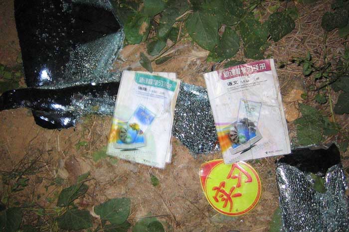 散落在岸边的面包车车窗玻璃碎片、驾驶员实习标志和乘车学生的课本