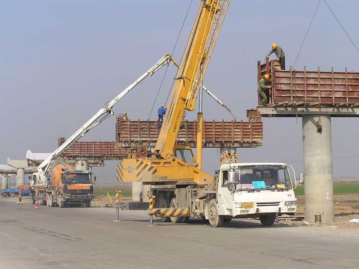 近日,笔者走访连云港市的重点交通工程新沂河大桥施工工地,被施工工地如火如荼的景象所感动。现场20多台大型机械和300余名筑路工人正在紧张的工作着:前台有的为桥台台帽的钢筋笼的起吊、安装服务,有的忙着为桥梁台帽的浇筑服务;有的忙着为已浇筑好桥梁台帽进行浇水养护;在大型的起重机上 “叼”着一片大梁正在循续渐进进行着大梁安装工作。后台有的忙着进行桥梁台帽、大梁钢筋笼的制作;有的忙着为大梁预制进行浇筑、养护。该工程由中铁十局集团承建。施工中施工单位科学安排、精心施工、保质保量,采用一系列新工艺,运用先进的施工机械,确保工程进度,一切都在有条不紊的进行着。从1月18日开工以来,到目前为止已全部完成钻灌柱桩工程,桥台的台帽已完成80%,大梁的吊装已完成21跨,计84片。