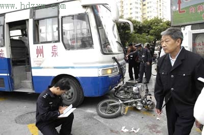50岁的邓师傅也是江西人,当时也坐在摩托车上等客,他的头部和腿部都受了伤,摩托车则摔倒在客车的左侧。