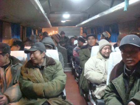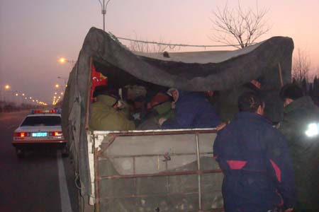 12月13日5时15分,平原县交通局稽查大队接到举报:两辆从黄河涯方向而来的农用四轮车,后斗用蓬布罩裹,满载人员正在快速行驶。大队人员接到举报后,组织人员迅速行动,于5时45分在315省道坊子段将该车查获。经查,两货车中一车载27人,一车载31人,均为在铁路沿线干活的农民工,由于天色渐晚急于赶路,车速极快,车上的人被颠得七上八下,令人心惊不已。根据有关规定,执法人员对驾驶员和乘车人员讲解了货车载人的危险性,在意识到自己行为的严重后果后, 稽查大队协调两部客车,将58名违法乘坐货车的农民工安全转运回家,随后依照有关规定对驾驶员进行了相应处罚。