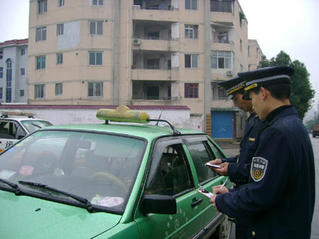 图为该所稽查人员近日冒着小雨上街对出租车的经营行为进行抽查