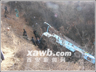 1月8日早晨9时20分,一辆满载乘客的客运班车从312国道永寿县永平乡前进村段掉入30米深沟,造成6人死亡的特大交通事故。不幸中的万幸是深沟里众多的刺槐拦挡住了继续下翻的车辆,保全了其余20多名乘客的生命,目前,事故的善后处理正在进行。