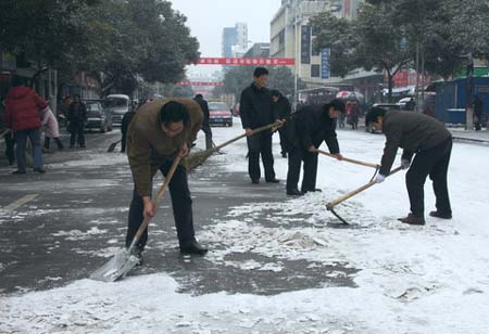 1月27日,夷陵区交通系统干部职工放弃双休日,走上城区街头及全区主要干线公路清扫积雪、检查安全、设置警示标志,提醒过往车辆及行人注意安全。