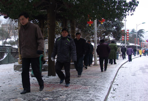 记者在县城街道上看到一些市民冒雪走路。对此,记者了解一些市民,“没办法呀,走路都要小心哟,坐车就更不安全,还是多走几步好些”我们的生命要紧,市民黄先生告诉记者;“以前我经常都是下午1点40了才从家里出发去上班,今天就不行了,出租车停了,只好吃了午饭就走,要不然会迟到的”,该县一公司职员告诉记者。我们对政府这种做法还是很理解的,因为公路上这么滑,要是万一出事怎么办?这证明政府对群众的生命安全还是放在首位的,我支持。家住城南社区的刘先生告诉记者。