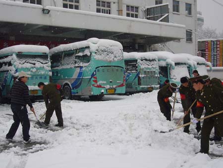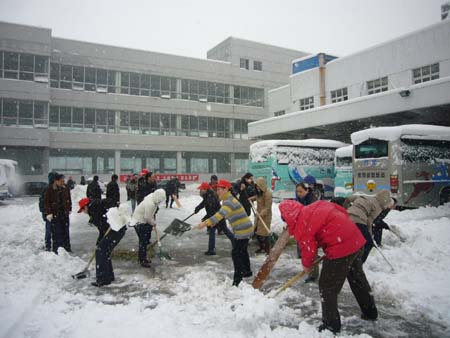 27日早晨6点多钟,各路扫雪队伍在集团公司和各单位领导的组织下,分别在车站和车辆停放地展开了扫雪会战。面对高达30多厘米厚的积雪,同志们采取铁锹掀、木板推和自制雪铲拉等形式,在短短的3个小时内,车场上地面积雪已全部铲除干净。正在镇江公路客运中心进行节日值班服务的驻镇73056部队的官兵也帮助车站清扫积雪。车站也准备了草包等防滑用品铺垫在旅客进站通道和站台等处,防止旅客滑倒。