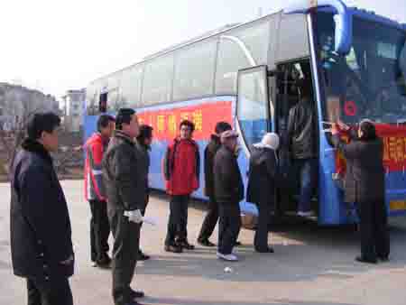 2月19日上午10:30,载着赣榆籍贵州安顺煤矿民工的第一批7辆豪华大客车开始从连汽赣榆公司驶出,踏上返程之旅。由赣榆县交通局等部门组织,连云港市三兴同心园旅行社承运的1660名赣榆籍民工今开始启程,赴贵州安顺煤矿工作。共有36辆大客车参与这次承运,分四个批次发车,预计明天下午将抵达贵州安顺煤矿。
