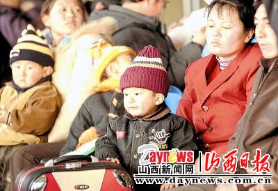 2月26日,在太原长途汽车站务工人员带孩子候车。近来,客运部门积极疏导,使大部分车辆正常发车。