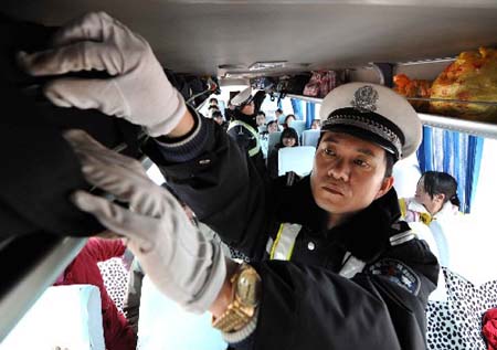 2月15日,在贵(阳)新(寨)高等级公路小碧收费站,贵新交警一大队的干警正在一辆长途客运车辆上执勤。