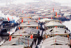 昨天下午,大运河扬州段,众多外地船民在扬州过年,每条船上都挂起了国旗。 尹德勤 摄
