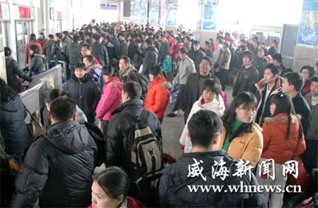 昨日,返乡乘客在威海汽车站候车室内检票准备上车。