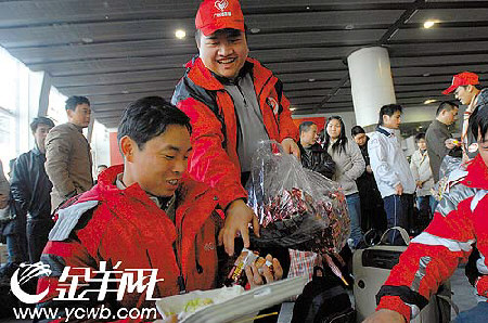 志愿者赵广军到琶洲展馆给滞留旅客送饼送水