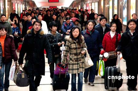 今年春运返京客流高峰提前到来,从2月9日开始,铁路客流持续走高,大年初五、初六将迎来返程客流高峰。图为福州火车站的节后旅客进站开始返程之旅。