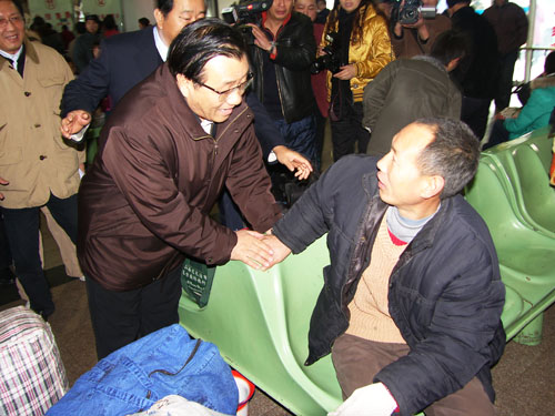 在洛阳汽车站北入口三品检查处,李盛霖部长语重心长地鼓励工作人员,一定要严把春运安全的第一道关,工作一定要做实做细,看似一个小小的安检标签,却关系旅客平安出行返乡的大事。在了解到集团公司除了在汽车站的出入口处设立三品检查仪配备专门的安检工作人员对旅客进站、上车、车辆发车前进行安全检查外,还在市内各个出入口设立专门的安全检查站进行行车中的安全检查时,李盛霖部长露出了满意的笑容。在现场查看了农民工购票点、绿色通道和专门为农民工设立的休息候车室时,李盛霖部长对集团公司心系农民工的做法表示赞许。在候车大厅和农民休息室内,李盛霖部长还热情地与几位在外打工行将返乡的农民工的手紧紧握在一起,进行攀谈,了解他们乘车的所想所需,并祝愿他们一路平安,过个祥和美满的新春佳节。在车站GPS监控中心,李盛霖部长对于集团公司自行研发的车载监控系统赞赏有佳,当得知集团公司所有客车已经全部安装该系统后,李盛霖部长给予了集团公司高度的赞许。在发车区,洛阳—温州、洛阳—金华的班车前,李盛霖部长又主动上到客车上,与当班驾驶员逐一握手表示慰问,祝愿他们一路好运。