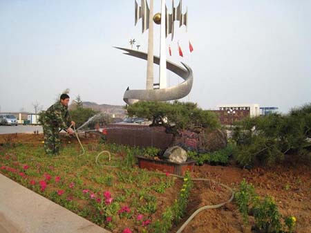 图为工作人员正为移植的泰山油松、迎客松等花卉苗木浇水