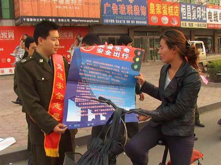 4月16日,山东省陵县公路局10名交通安全志愿者走上街头,宣传交通安全知识,拉开了该局“文明公路、喜迎奥运”主题活动的序幕。志愿者们在主要交通路口悬挂宣传标语、发放宣传材料向路人介绍路政管理及交通安全知识,深受群众欢迎。图为志愿者为过往行人发放交通安全宣传画报。