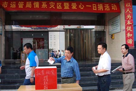 5月12日发生在汶川等地区的大地震,震动了全国。震区人民遭遇的灾难,深深牵动了焦作市运管系统广大干部职工的心。全系统干部职工迅速行动,于5月15日下午组织开展了“一方有难,八方支援 ”捐款献爱心活动。