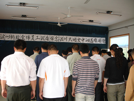 5月19日14时28分,山东高速股份有限公司滨州黄河大桥管理处机关全体员工齐聚办公楼四楼会议室默哀三分钟,沉痛悼念在此次汶川地震中的死难同胞。