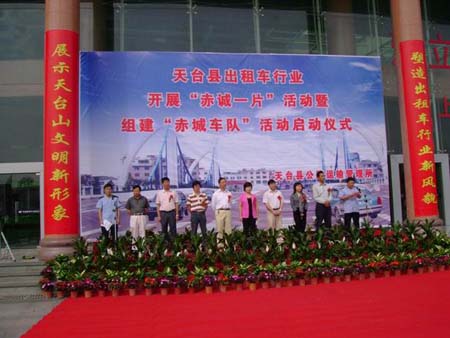 为进一步提高出租车服务质量和服务水平,着力营造“争当文明使者、共创和谐天台”的良好氛围,提升天台山文明旅游城市的品位,6月2日上午,浙江省天台县运管所在客运中心广场隆重举行全县出租车行业 “赤诚一片”活动暨创建“赤城车队”活动。县委常委、宣传部长裘国宏,县人大常委会副主任杨胜骏,副县长许世斌,县政协副主席茅玉芬出席了活动。